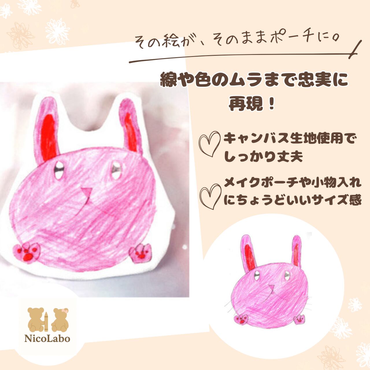 お子さまの描いたイラストはもちろん、ロゴやお気に入りの絵も写真も、そのままキャンバス素材のポーチにプリントできる特別なオーダーアイテム。