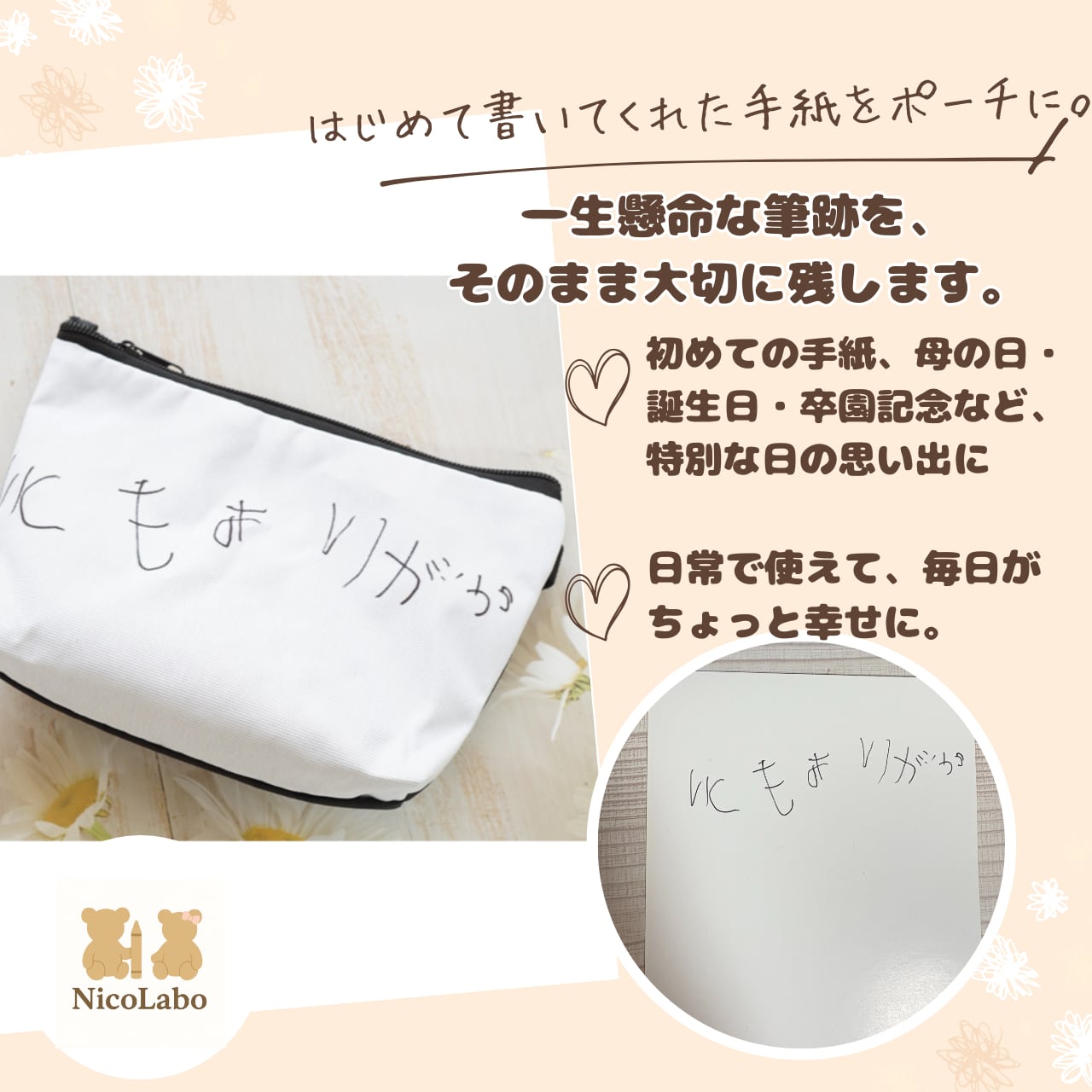 お子さまの描いた手描きイラストや「はじめてのお手紙」を、そのままキャンバス素材のポーチにプリントした特別なオーダーアイテムです。